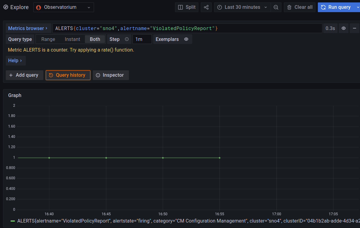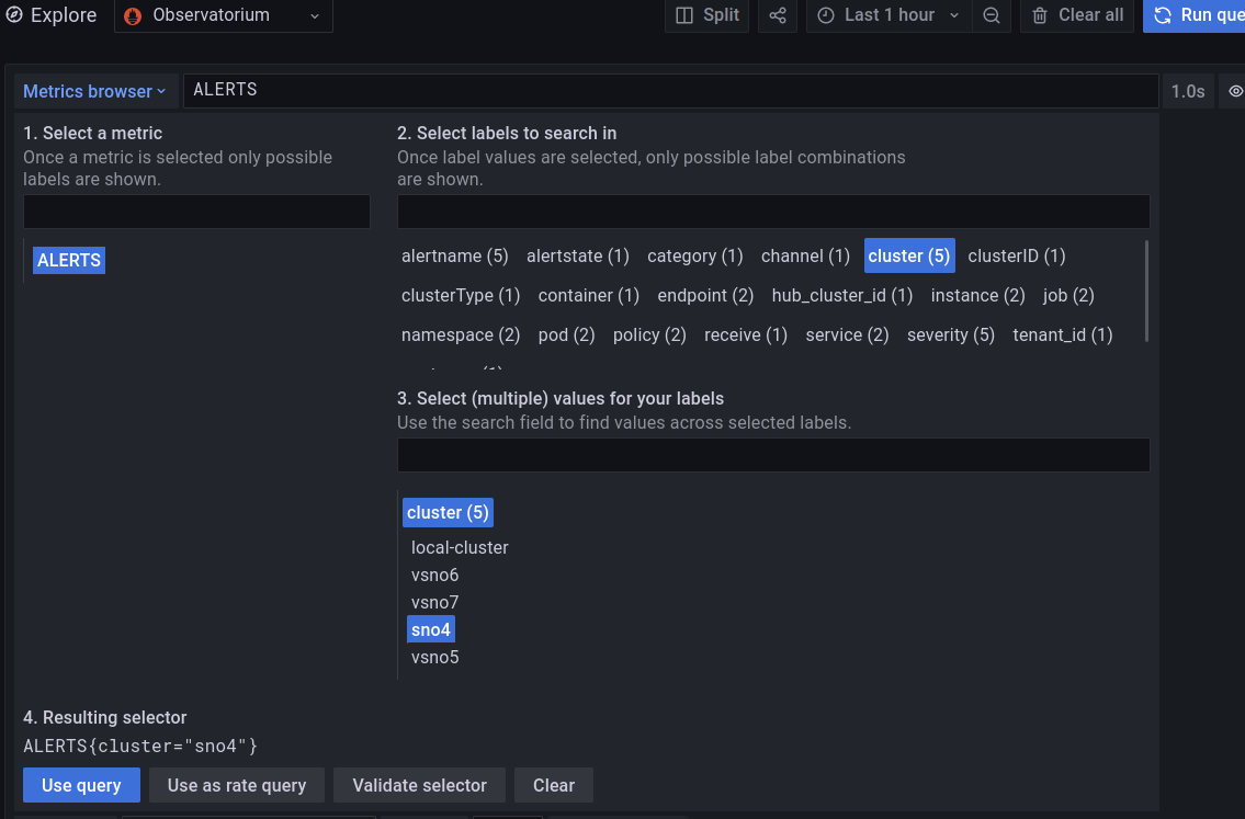 Notice, how the wizard helps you to take a metric (actually an “Alert”) and helps you to filter by cluster, pods, or other options.