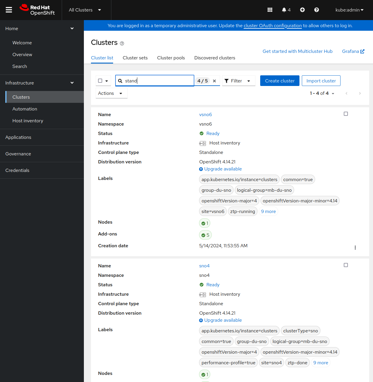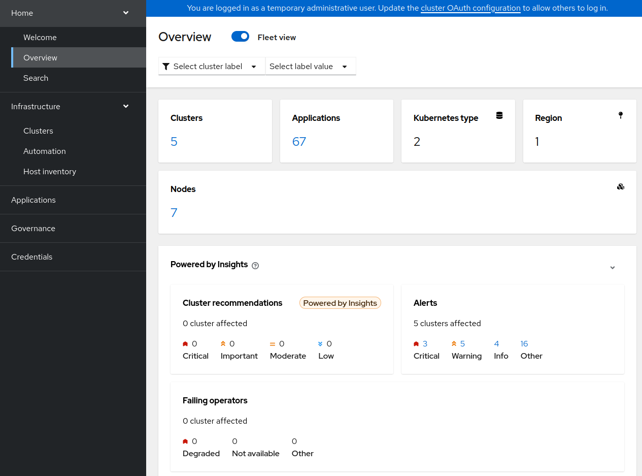 Once everything is enabled, you can have a very quick observation of your clusters, directly from the RHACM Overview console.