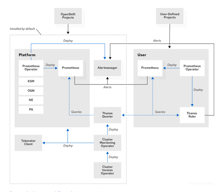 First of all, every cluster using Openshift Cloud Platform deploys a cluster operator called Openshift Cluster Monitoring.