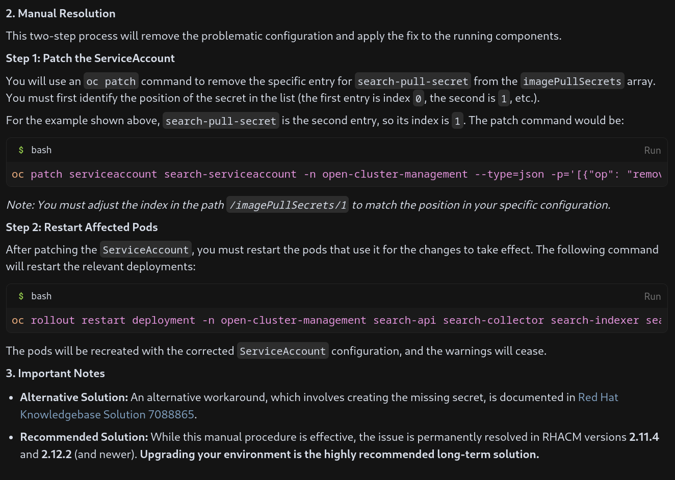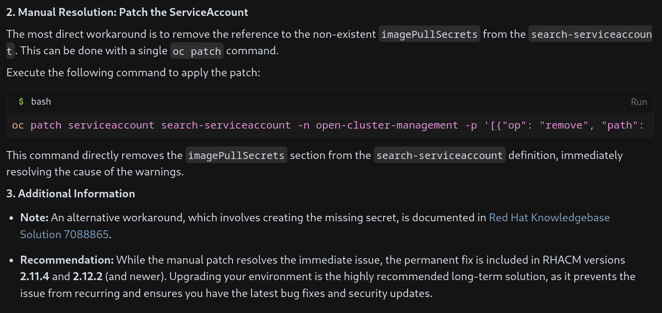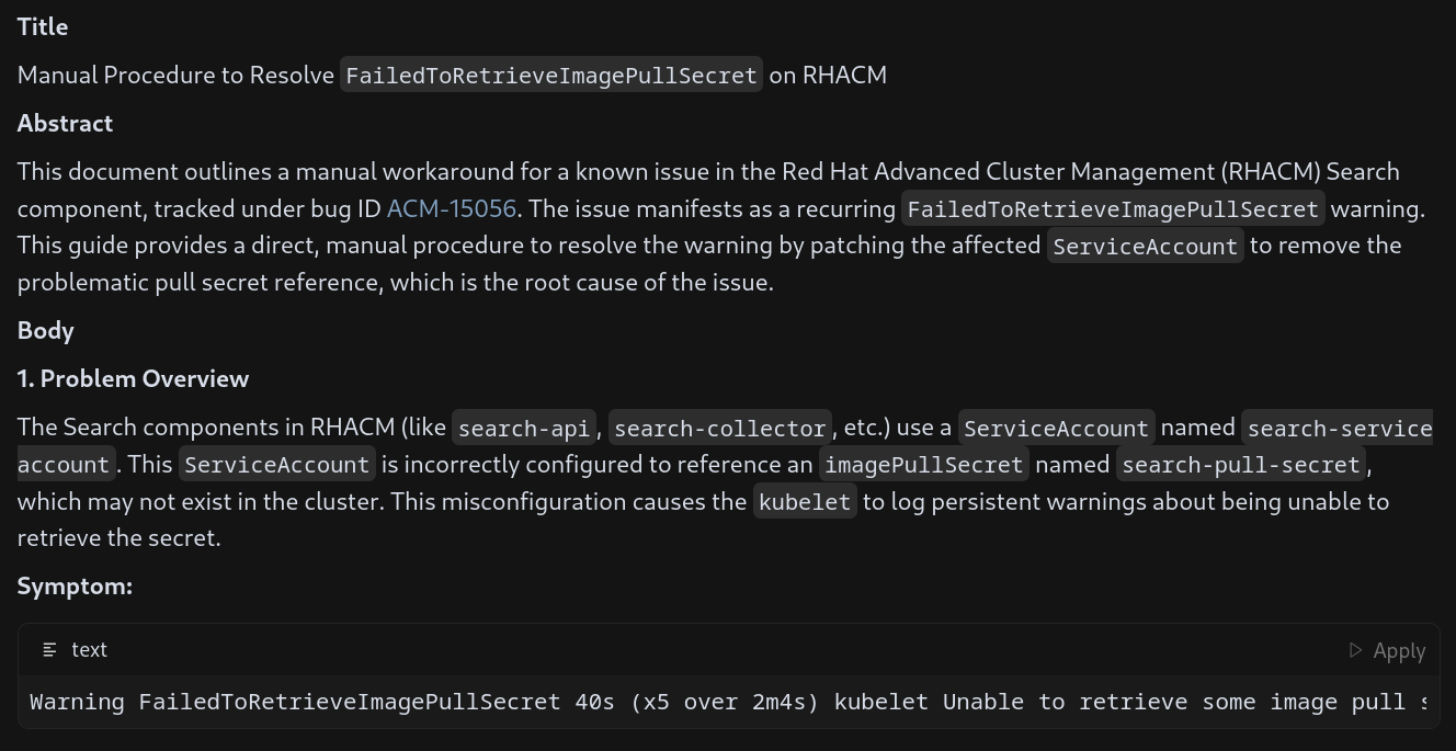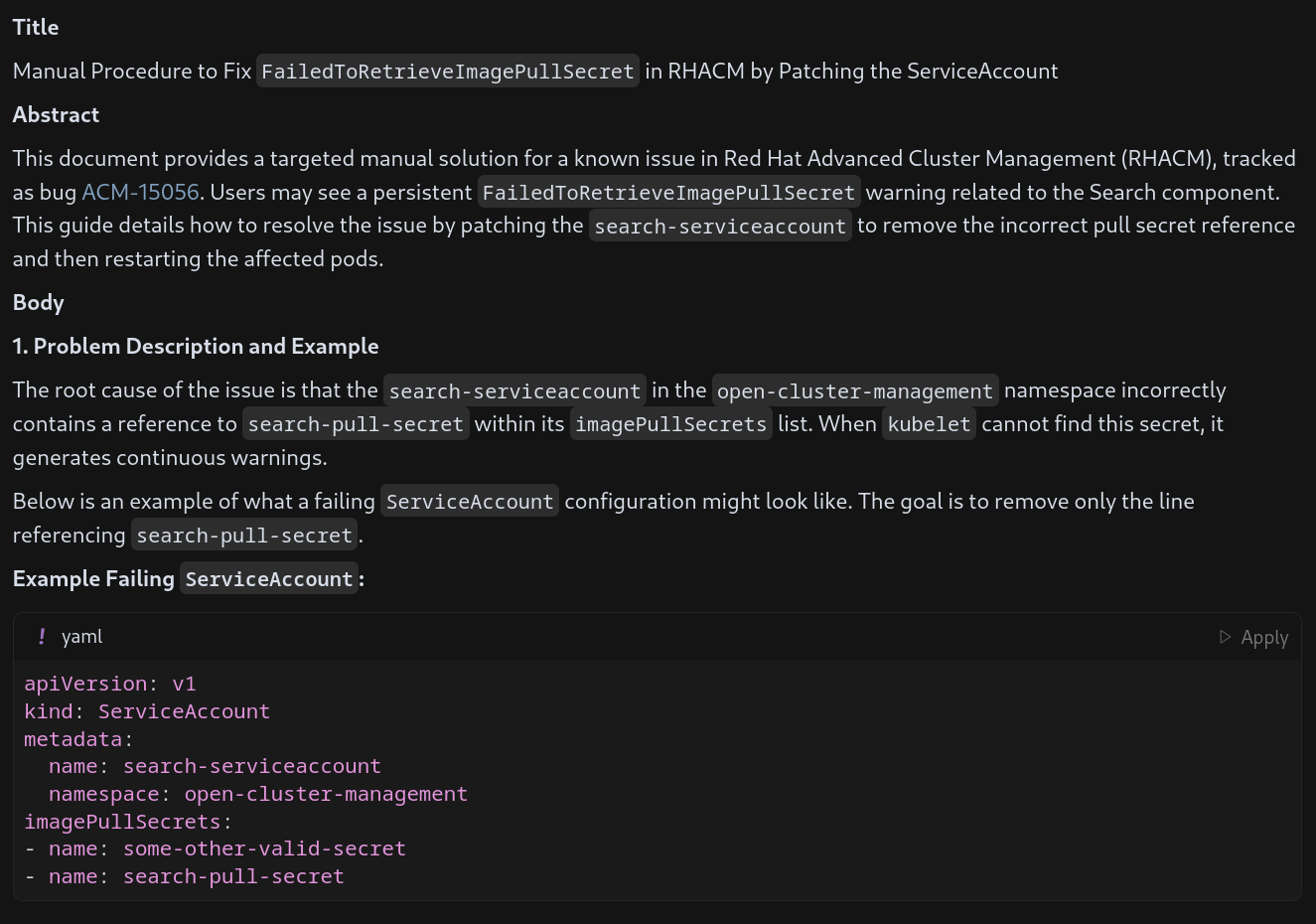 Not bad for a first attempt, it is focusing on an existing KCS that points you to create the missing pull-secret. This is not the workaround we want to document, I want the one about: the pull-secret is no longer needed.