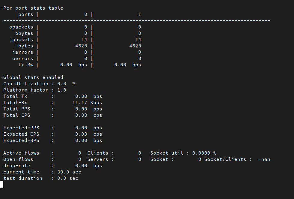 tui> start -f /opt/tests/testpmd.py -m 1mpps -p0