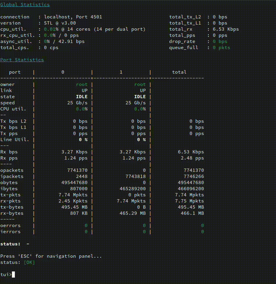 Execute ’tui’ command to enter in a visual/dashboard with statistics of what is happening on the ports. Not very much should be happening yet.