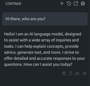 But even if curl is always cool, it does not help very much about integrating and AI model in our daily tasks. Following, I will integrate the model using different tools. The model will be used as a chat bot, code/doc correction and execute some tasks. Of course, everything using Open Source.