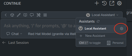 Access to the Continue Local Assistante configuration with: