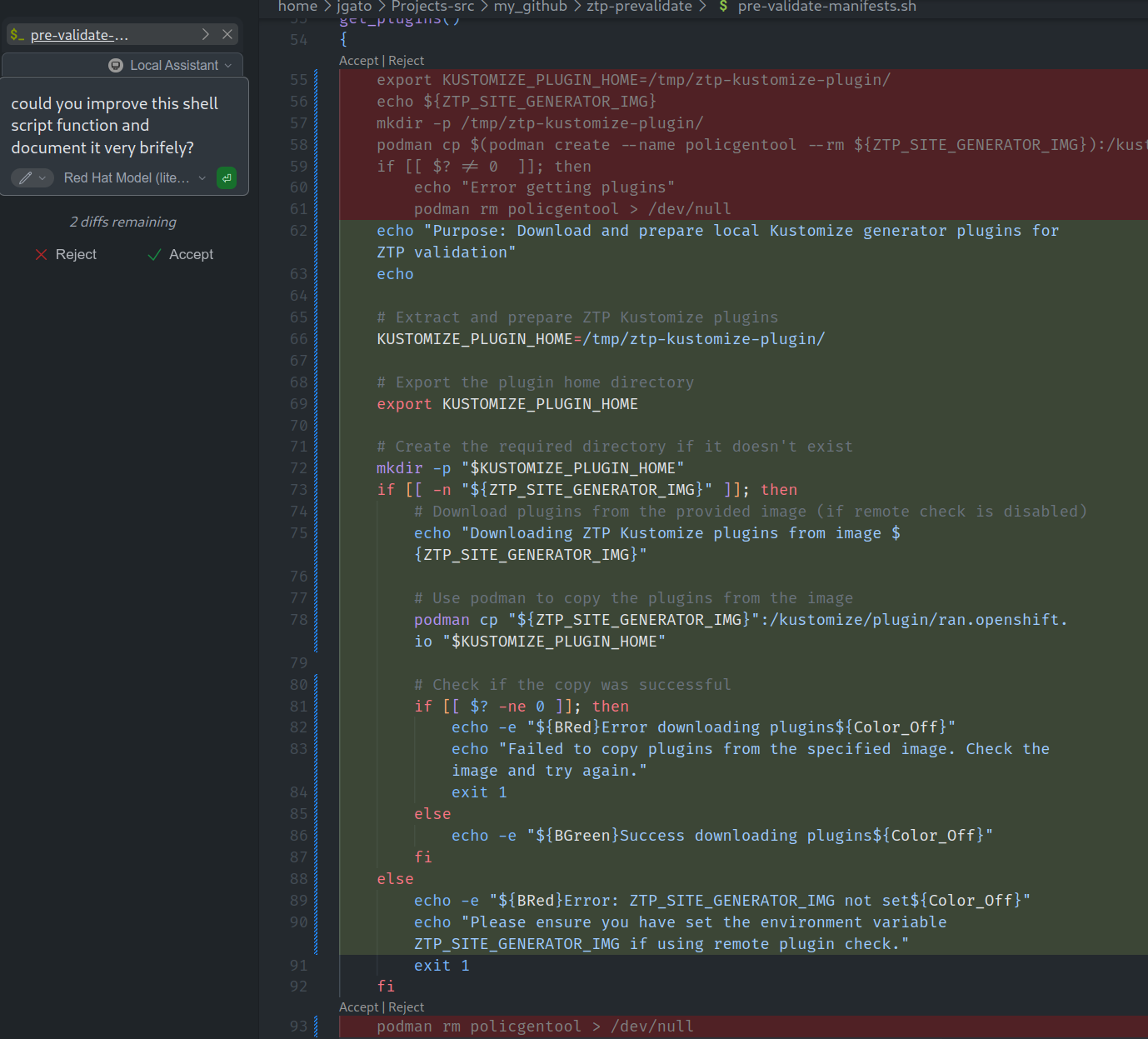 Now, that I have the model integrated in different ways, I can use for different tasks. Because chat with is cool, but not enough. So, I want to make it help me with some daily tasks. Here I have a shell script far from been perfect. So, I will ask Granite for help me to improve it: